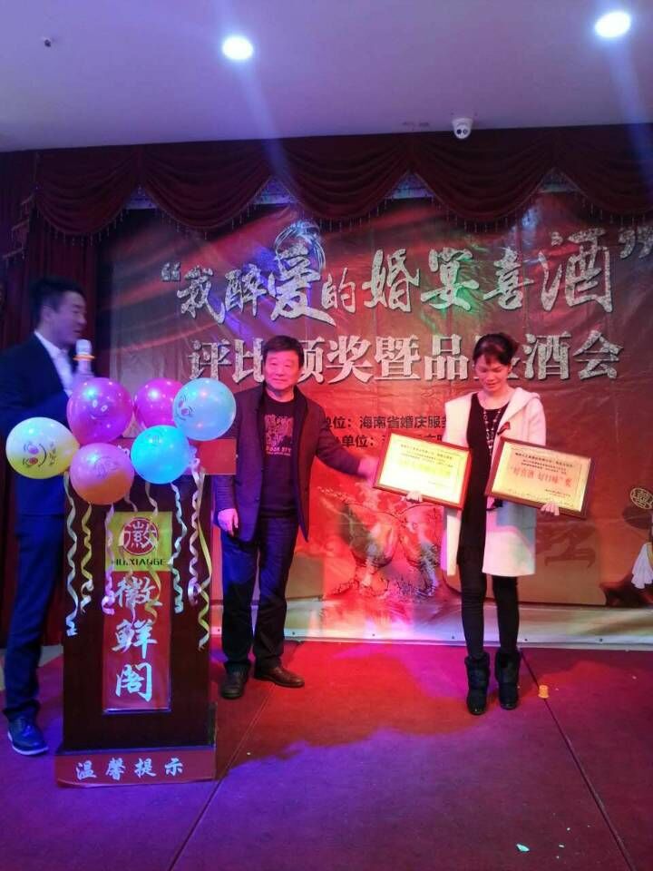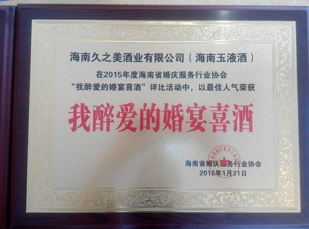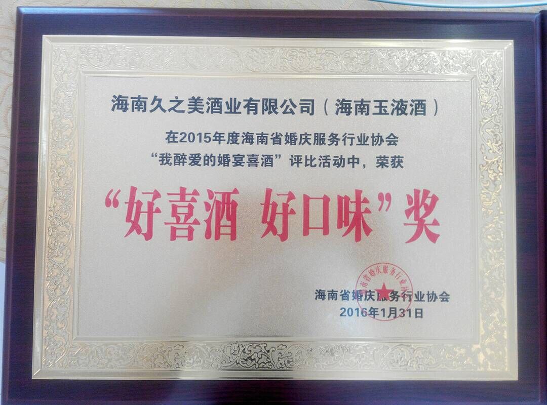 海南久之美酒業(yè)有限公司(海南玉液酒)榮獲海南省婚慶服務(wù)行業(yè)協(xié)會頒發(fā)的2015年海南省“我醉愛的婚宴喜酒”牌匾以及“好喜酒 好口味”獎牌。