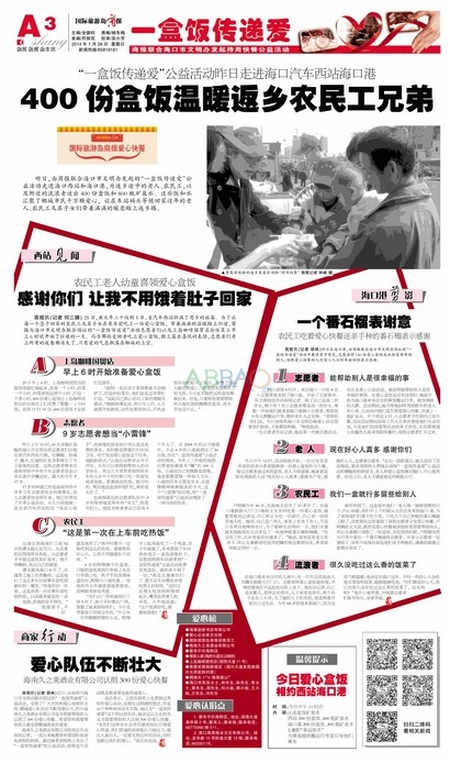 高總表示,之前在報紙上也看到過類似的愛心活動,還萌生過捐酒的想發(fā).但是由于種種原因沒有實現(xiàn),她認(rèn)為"一盒飯傳遞愛"這個倡議很實在,就決定以企業(yè)的名義為需要幫助的人認(rèn)捐300份愛心快餐."有你們這樣有社會責(zé)任感的報社引領(lǐng)愛心傳遞,我們普通的商家能出力就出力,能出人就出人,一定要支持這樣的活動,同時也獻出我們的愛心."高總?cè)缡钦f.